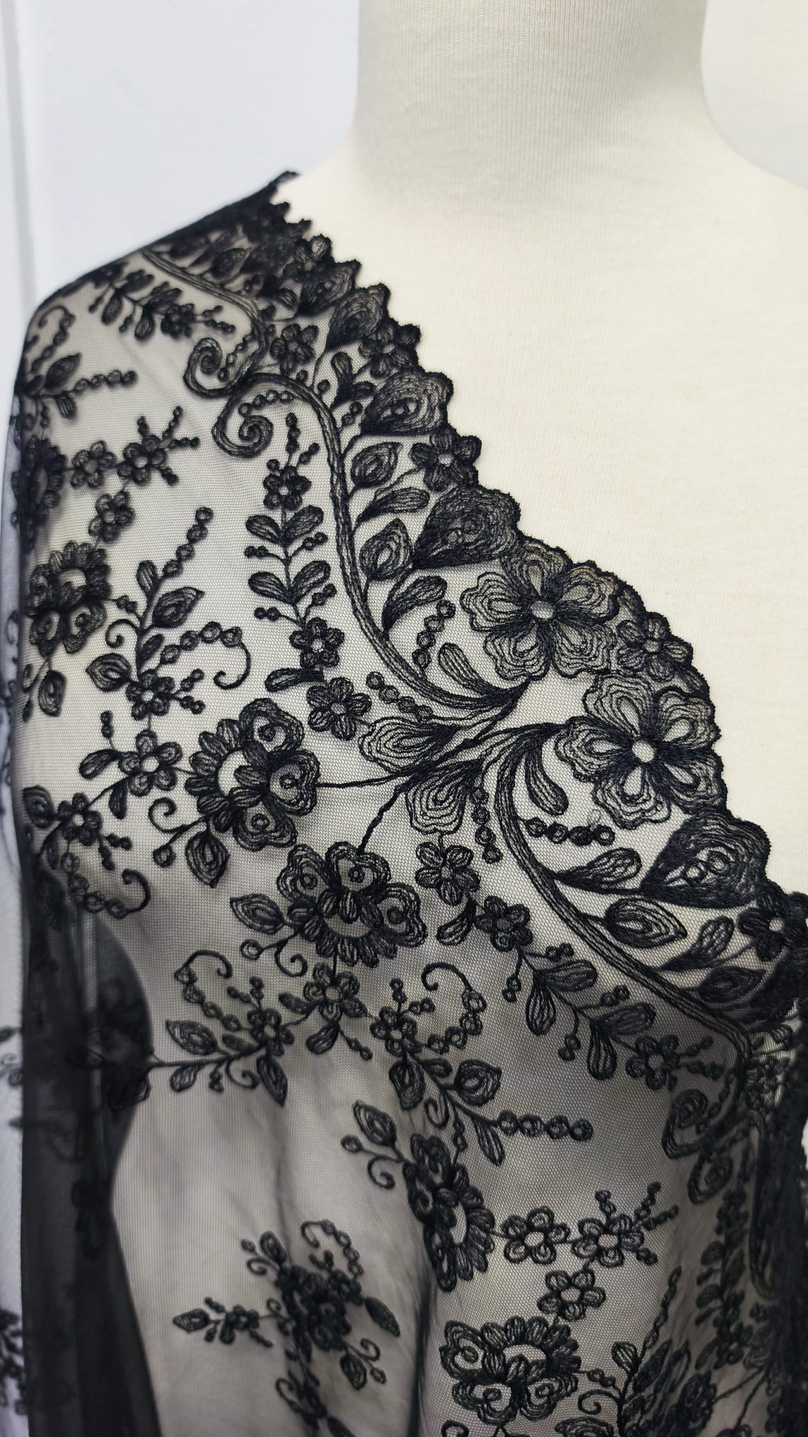 Mantilla Bordada a maquina en Tul Cristal con acabado efecto artesano.